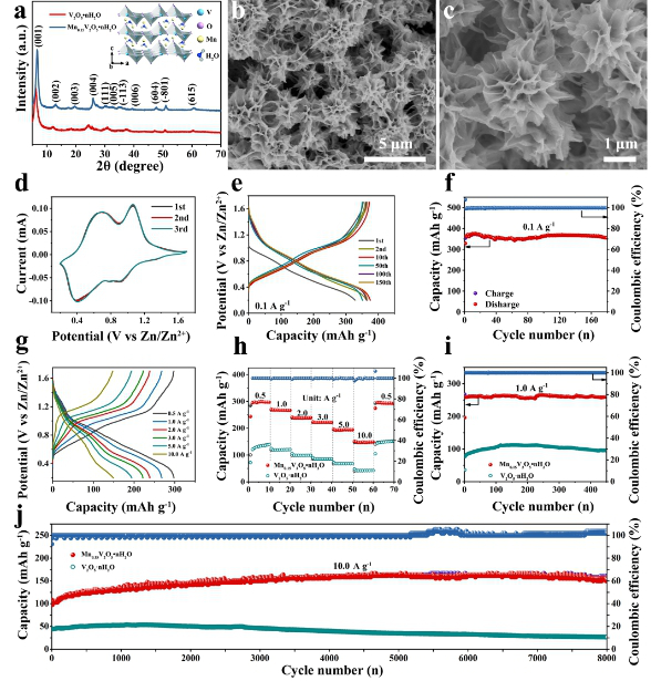In view of this, the team of Professor Li Chengchao of Guangdong University of technology used interlayer manganese ion and water molecular doping to improve the zinc ion transport kinetics of vanadium pentoxide cathode material, and studied its electrochemical zinc storage performance and mechanism as a zinc ion battery cathode material.The results show that the synthesized mn0.15v2o5·nH2O has excellent zinc storage performance, and its reversible capacity is up to 367 MAH g (0.1 AG-1).After 8000 cycles at high current densities of 10 and 20 a g, the specific capacity can still be maintained at 153 and 122 MAHG.Even at the low temperature of - 20 OC, the specific capacity can be stabilized at 100 MAH g at a current density of 2.0 A G for 2000 cycles.The excellent electrochemistry of the material is mainly attributed to the synergistic effect of manganese ions and water molecules, which not only improves the electronic conductivity of the electrode material, but also effectively enhances the insertion and desorption kinetics of zinc ions.Moreover, due to the ion pillaring and local charge interaction, the structural stability of the electrode material in the cycle process is greatly improved.In this work, the phase structure and micro morphology of mnv2o5·nH2O electrode material during charge and discharge were studied by means of in-situ XRD and TEM techniques. The electrochemical zinc storage mechanism was revealed, which provided a basis for the design and synthesis of high rate and long cycle performance cathode materials for zinc ion batteries.The related paper "electronic structure regulation of layered vanadium oxide via interlayer doting strategy towards superior high rate and low temperature zinc ion batteries" was published online on advanced functional materials (DOI: 10.1002 / ADFM. 201907684).-1-1-1-1-10.15