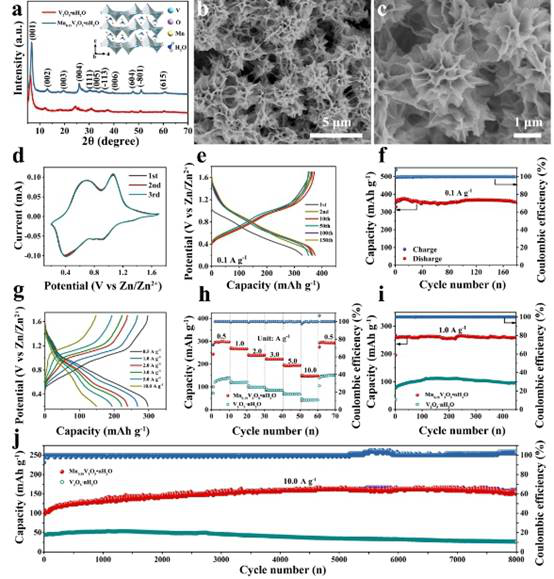 Figure 1. Structure, morphology and electrochemical performance ofMn0.15V2O5·nH2Ocathode material