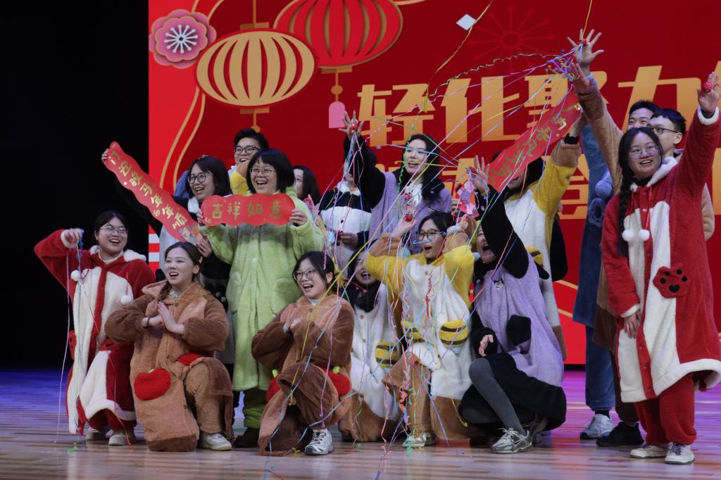 学院党政办公室老师带来的集体表演《健康“到到令”》,节奏明快,动作活泼,在趣味互动中传递了健康生活的理念。基础教学中心全体教师的大合唱《我和我的祖国》,歌声嘹亮,激情澎湃,深深感染了在场每一位观众。化工系教师最后的歌曲串烧《骏马追星・驰梦未来》,歌声充满力量,以奋进之姿将联欢会热烈气氛推向最高潮。节目中穿插的抽奖互动环节,更添惊喜与乐趣,现场始终洋溢着祥和、喜庆与温馨的浓浓年味。